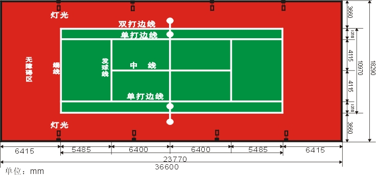 場地規格: 標準網球場地為長78英尺(23.77米),單打寬27英尺(8.23米),雙打寬36英尺(10.97米)的矩形。發球線至底線的長度為18英尺(5.485米),發球線至網線的距離為21英尺(6.4米)……