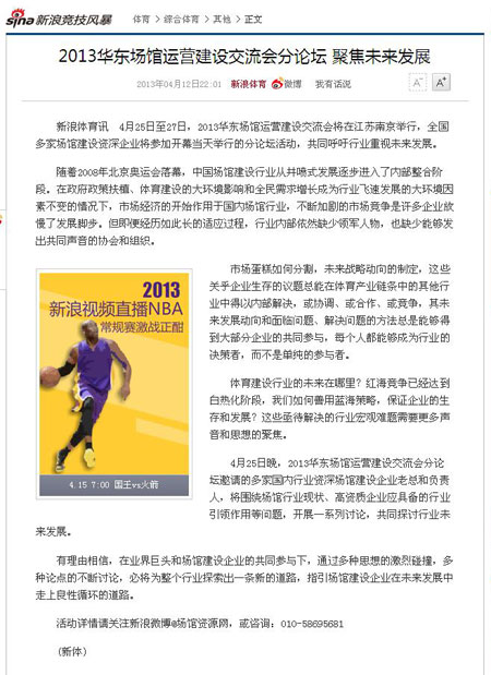 繼搜狐體育關注2013華東場館運營建設交流會分論壇籌備情況后,新浪體育也于4月12日發表了題為《2013華東場館運營建設交流會分論壇 聚焦未來發展》的報道,文中對此次分論壇……