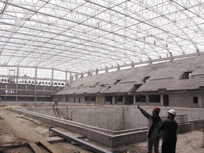 游泳館內的施工場景 10月8日,在大連體育中心游泳館施工現場,記者看到,場館的泳池和看臺等土建工程已完工,主頂鋼網架也架設完成,中鐵十三局一公司施工人員正在進行四……