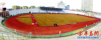 弘誠體育場工作人員正在對鋪設不久的草皮進行噴水養護 青島作為第十一屆全運會協辦城市,將在弘誠體育場進行男子足球比賽。為此,工程方專門購進了棗熟禾、黑麥混……