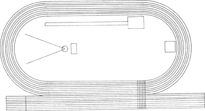 特點:也能充分利用競賽規(guī)則中有關場地坡度與成績的關系和有利于運動員提高公平競賽,但在進行短距離項目比賽時,必須設輔助裝置作運動員的緩沖地帶。這種場計和布置,國外普遍采用。
