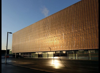 這座能容納7000人觀賽的場館,占地面積為32000英尺。顧名思義這座銅鄉(xiāng)館的外形四四方方像個箱子,而場館的外層是絕大部分是由回收來的金屬銅制作而成。