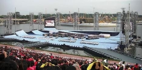 新加坡濱海灣的浮動體育場是世界上最大的漂浮舞臺——濱海灣浮動舞臺,可承受9000人、200噸舞臺道具和3輛300噸軍車的重量。這只是一個平臺,鄰近的看臺可容納3萬名觀眾。濱海灣浮動舞臺漂浮在新加坡濱海灣水庫的水面之上,不僅可用于舉辦比賽,同時也可用于舉行音樂會、展覽會、文化藝術表演以及國慶節閱兵。