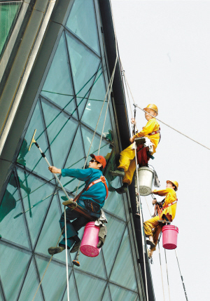 工人們清洗龍崗大運體育中心主體育場外墻。