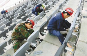 工程人員為大運體育中心安裝座椅。