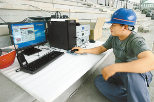 工程人員在大運中心體育場調試設備。