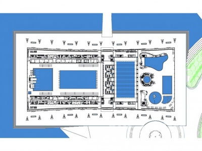 水是這個項目所有結構的主導型元素,它也是不同結構之間的連接性元素,它們出現在人工湖那高抬的平面上。圓形的場館有一個弧形的湖水邊線環繞,而矩形的游泳池則是由一條直線形的湖水邊線環繞。設計上的相似性,共同的主題和相似材料的使用使三個場館有著結構上的統一性。巨大的帶有大型三角形元素的鋁制拱形鋼鐵構架沿著附屬結構形成雙面的弧形表皮,使人們想到了隨風飄起的風帆。