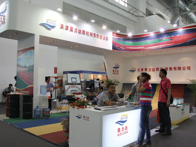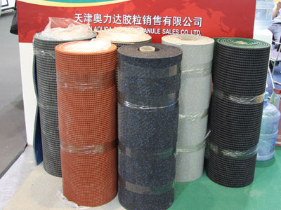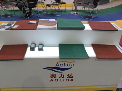 天津奧力達膠粒銷售有限公司今年的體博會展位設計中,將六種不同色彩的卷材作為地面裝飾,頗有一絲將天邊彩虹摘下的意味。在展位上,觀眾能夠通過最直觀的觸感,感受到奧力達產品在腳下的彈性和硬度。現場展品中還有奧力達的彩色塑膠顆粒以及卷材成品,以保證觀眾能夠從不同角度了解公司從事銷售的產品。