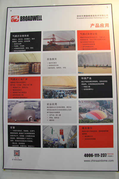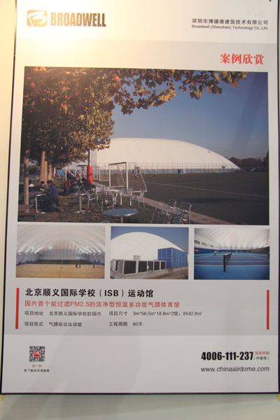 一走進深圳博德維的展位,來自氣膜結構最直觀的展現就映入參觀者的眼簾。一座座膜結構組成的運動場所通過圖片和文字的形式,向每一個前來參觀的成員講述著自身所蘊含的科技成果。