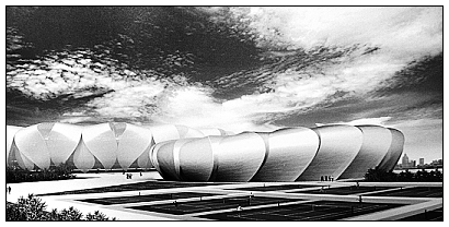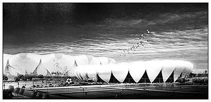 網球中心方案之二:賽幕徐開 取意徐徐旋轉開啟的賽事帷幕。給人以動感,同時巧妙運用不同單元間的交疊部分作為場館主要出入口,方式獨特。
